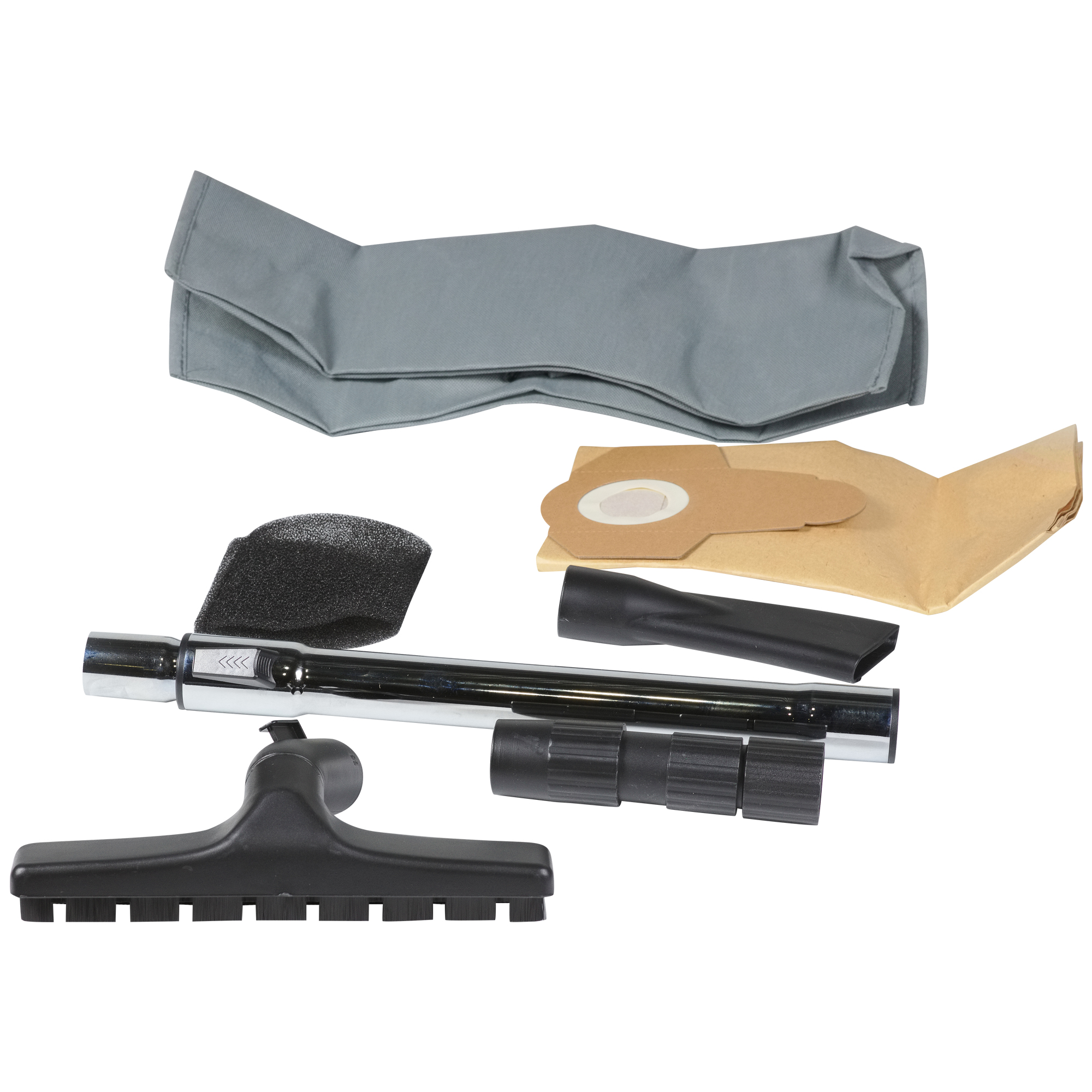 • Бумажный одноразовый мешок • Тканевый многоразовый мешок • Фильтр тонкой очистки HEPA • Фильтр для влажной уборки • Пластиковый гофрошланг • Трубка составная • Насадка универсальная • Насадка щелевая • Колесо 4 шт. • Комплект адаптеров для подключения к электроинструменту